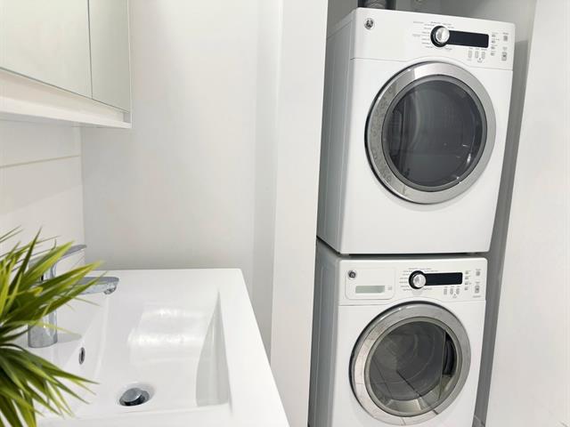 Réfrigérateur, cuisinière, four à micro-ondes, lave-vaisselle, lave-linge, sèche-linge, rideau, eau chaude, 2 tables, 2 chaises, 1 étagère, 1 lit queen size avec matelas, 1 table de chevet, 1 lit de jour.