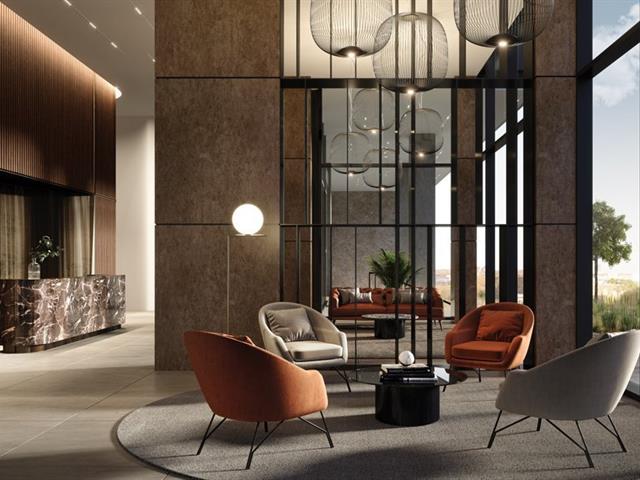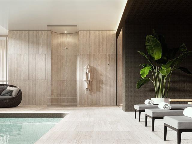 Amenities dans la Quinzecent: Espace de dépose-minute privé et couvert pour plus de confort. Hall d'entrée moderne avec plafonds de 5,5m. Service de sécurité 24/7 et conciergerie personnalisée. Piscine intérieure chauffée, sauna sec et hammam. Salle de sport entièrement équipée avec studio de yoga. Terrasse lounge avec cuisine extérieure et cinéma. Salon privé réservé aux résidents.