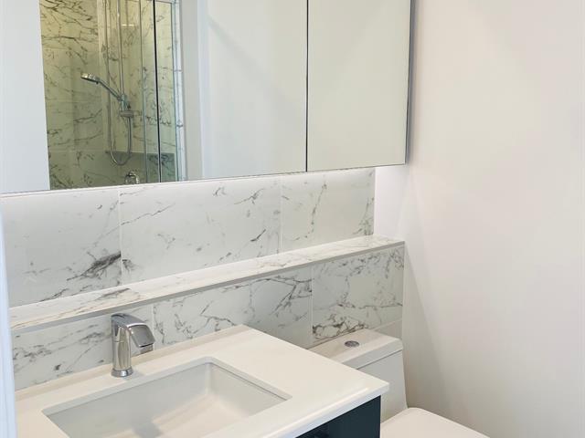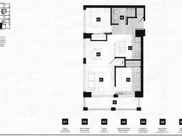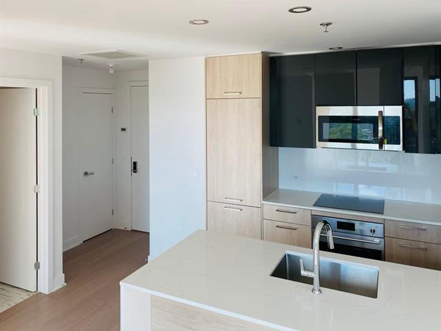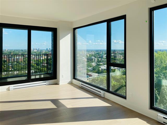 -Unité de coin au 9e étage offrant 2 chambres et 1 salle de bain, bénéficiant d'une orientation sud-est et sud-ouest, avec une vue éloignée sur le fleuve Saint-Laurent, ainsi qu'une vue dégagée sur la ville et les espaces verts. Le salon est entouré de trois façades de fenêtres pleine hauteur, offrant une vue panoramique entièrement dégagée. Les deux chambres disposent également de grandes fenêtres pleine hauteur avec de magnifiques vues, assurant une luminosité abondante dans toutes les pièces. La fenestration à double vitrage assure une excellente insonorisation, tandis que le chauffage et la climatisation centrale garantissent un confort optimal en toute saison. L'unité se distingue par une luminosité exceptionnelle et une grande intimité.