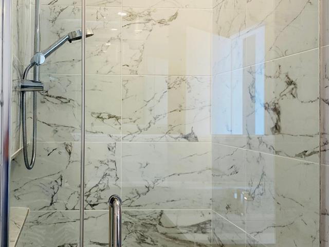 -Plusieurs améliorations intérieures ont été apportées par rapport à l'unité standard : planchers haut de gamme choisis en surclassement, aménagements personnalisés dans tous les garde-robes avec multiples étagères et supports, plafonds repeints en blanc pour un effet plus lumineux. Des luminaires supplémentaires ont été ajoutés dans la cuisine et les chambres, et la salle de bain a été bonifiée par l'installation d'un pommeau de douche au plafond.