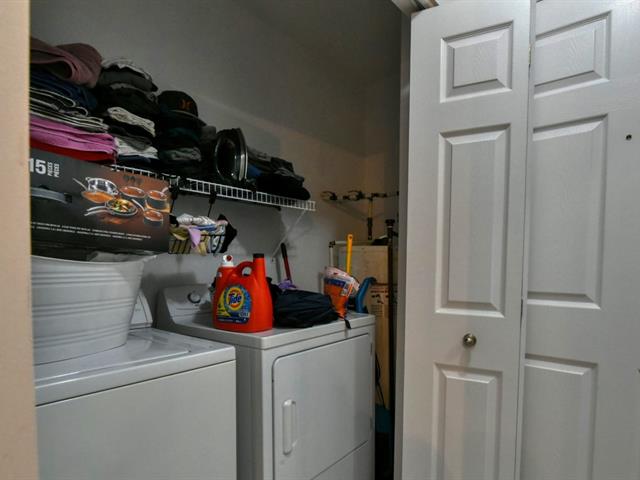 Laveuse et sècheuse, réfrigérateur, cuisinière, lave-vaisselle, table de cuisine avec 4 chaises et une bibliothèque. 1 place de stationnement extérieure.