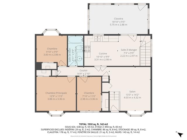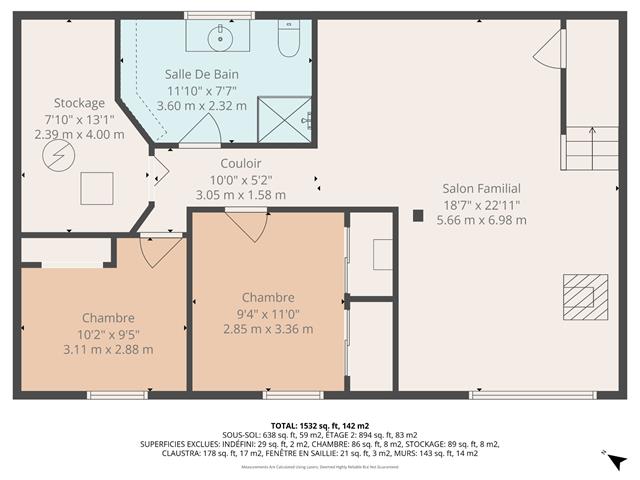 | Salle de bains | 11.10 x 7.7 P | Sous-sol | Tuiles |