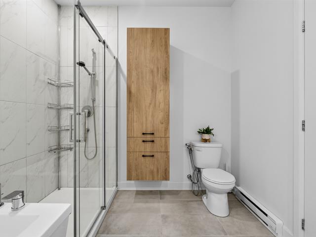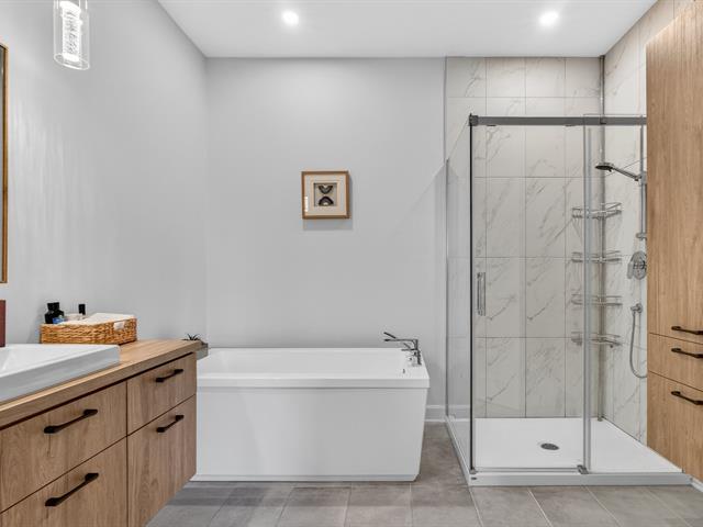 La salle de bain principale, spacieuse et élégante, propose une douche vitrée moderne ainsi qu'un bain, offrant confort et fonctionnalité. Une salle d'eau supplémentaire vient compléter l'unité pour plus de commodité.