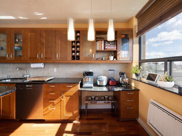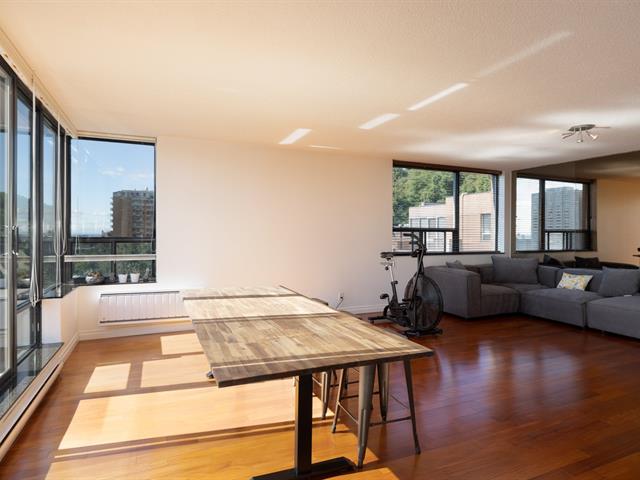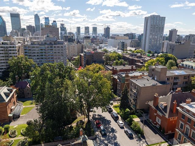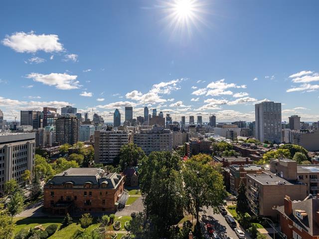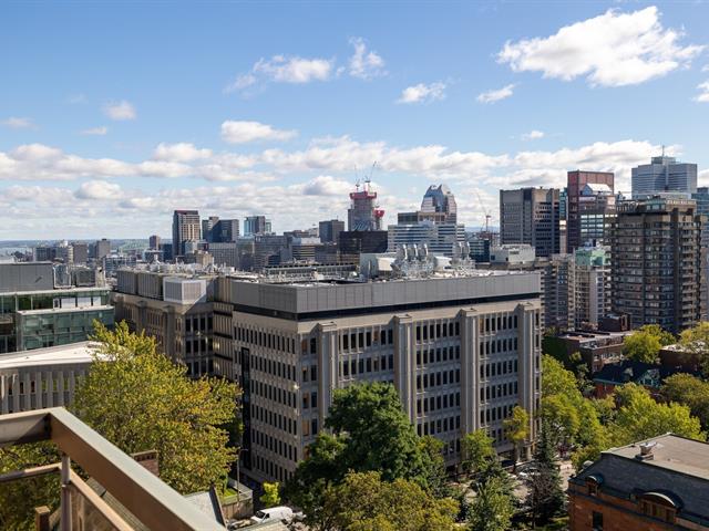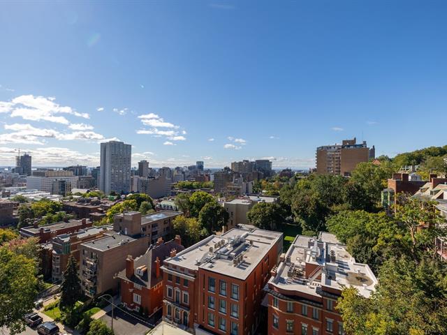 This is a large sun filled 2-bedroom corner penthouse facing South West, located in the heart of Golden Square Mile, steps from Mount Royal and the vibrant downtown area. It offers incredible panoramic city views up to the Jacques Cartier bridge, high ceilings, generously sized bedrooms, 1 garage, 24H doorman, an indoor pool and sauna.