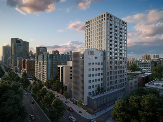 THE ICONIC LA TOUR FIDES - BE A PART OF MONTREAL'S HISTORY. Commercial space located on the ground floor of the brand new La Tour Fides residential tower in the heart of the Quartier des Spectacles. This space features an expansive, open-concept base building, concrete floors, up to 15-foot ceilings, and large windows allowing for plenty of natual light. This space will cater to many types of businesses looking to benefit from great foot traffic and visibility all day long, with direct access to René Levesque blvd. Steps away from Ville-Marie hwy and CHUM hospital. Easy to visit!