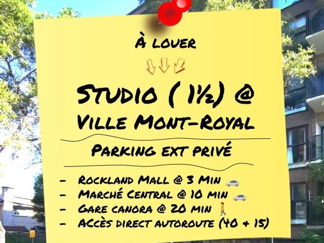 Large studio (1 ½) semi-furnished in a soundproof concrete building with large bathroom, private outdoor parking (not included), secure entrance (camera & intercom) and large balcony. Nearby services: Rockland Shopping Center (3 minutes), Central Market (10 minutes), REM and Canora train station (6 minutes), Direct access to highways 40 and 15. Included: Heating, Hot water, Refrigerator, Stove, Washer & dryer in the building, Wardrobe and private locker.