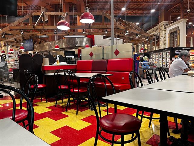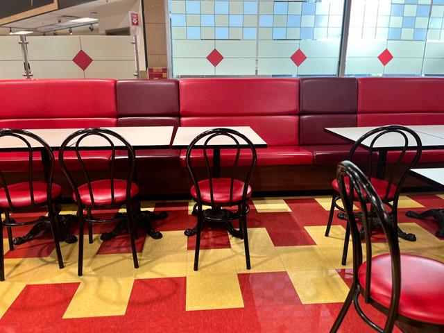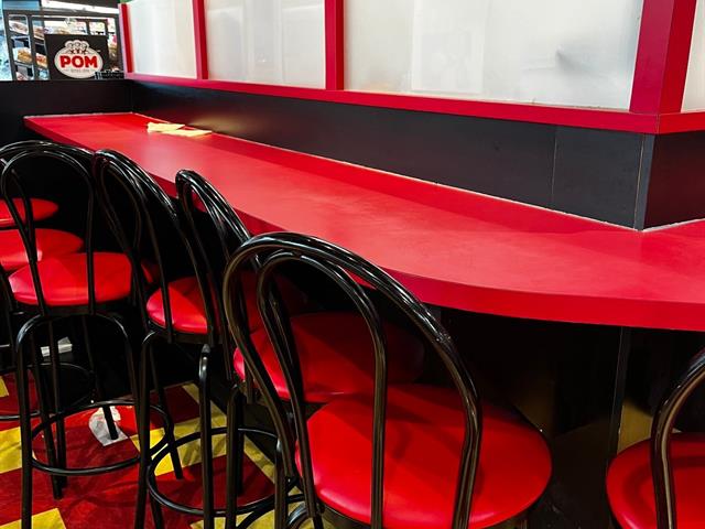 - Tables and chairs next to the counter provide customers with on-site dining service.