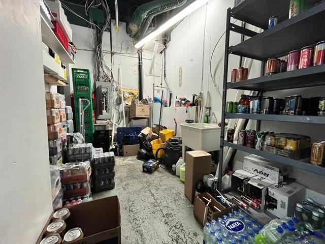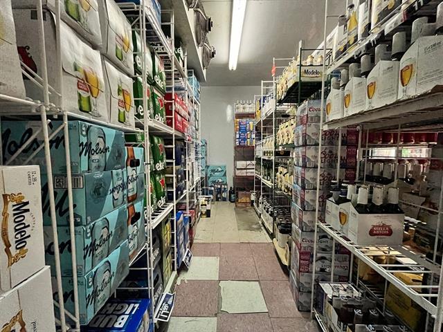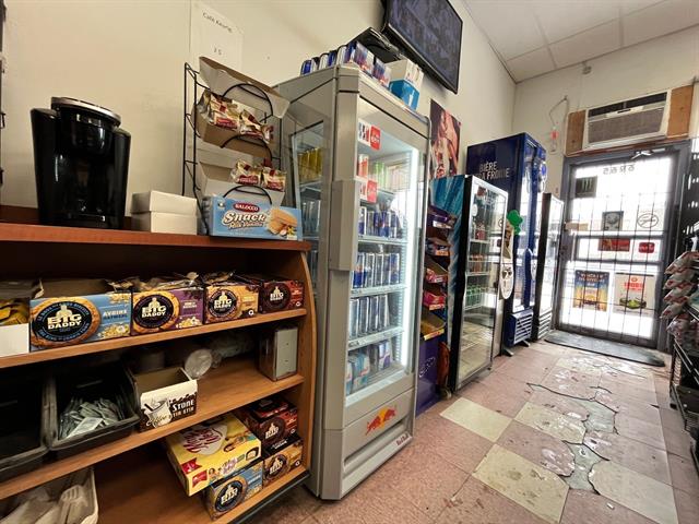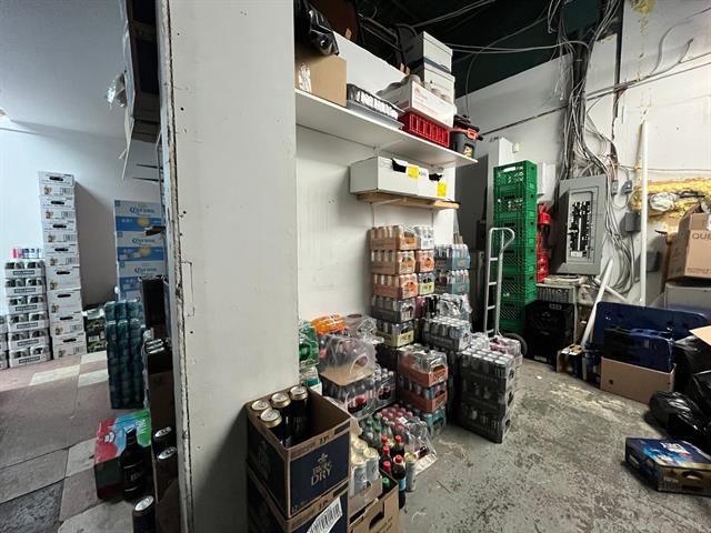 3 air conditionners, walk-in beer fridge, cash register, shelving, 3 fridges, counter, racks, freezer, humidor